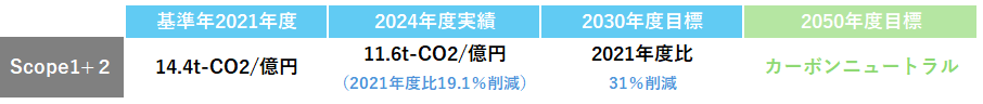 当社グループは、2021年度よりLCIデータベースIDEAv2(サプライチェーン温室効果ガス排出量算定用)に基づいてCO2排出量を算定しており、Scope1とScope2における中長期的な削減目標を設定しました。