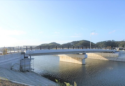 当橋りょうは宮城県東松島市に位置し、震災からの復興事業として整備が進められている避難道路(東名・新東名線)の一部で、地域の生活道路や災害時の避難道路としての役割を担います。地元の小学生が作製した橋名板もお披露目されました。2020年10月竣工。